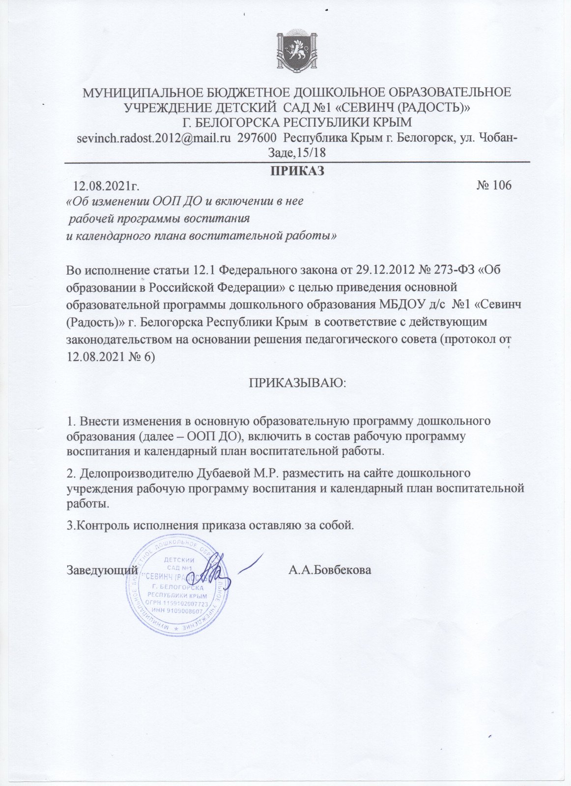 Основные сведения об образовании в МБДОУ д/с №1 «Севинч (Радость)» г. Белогорска Республики Крым